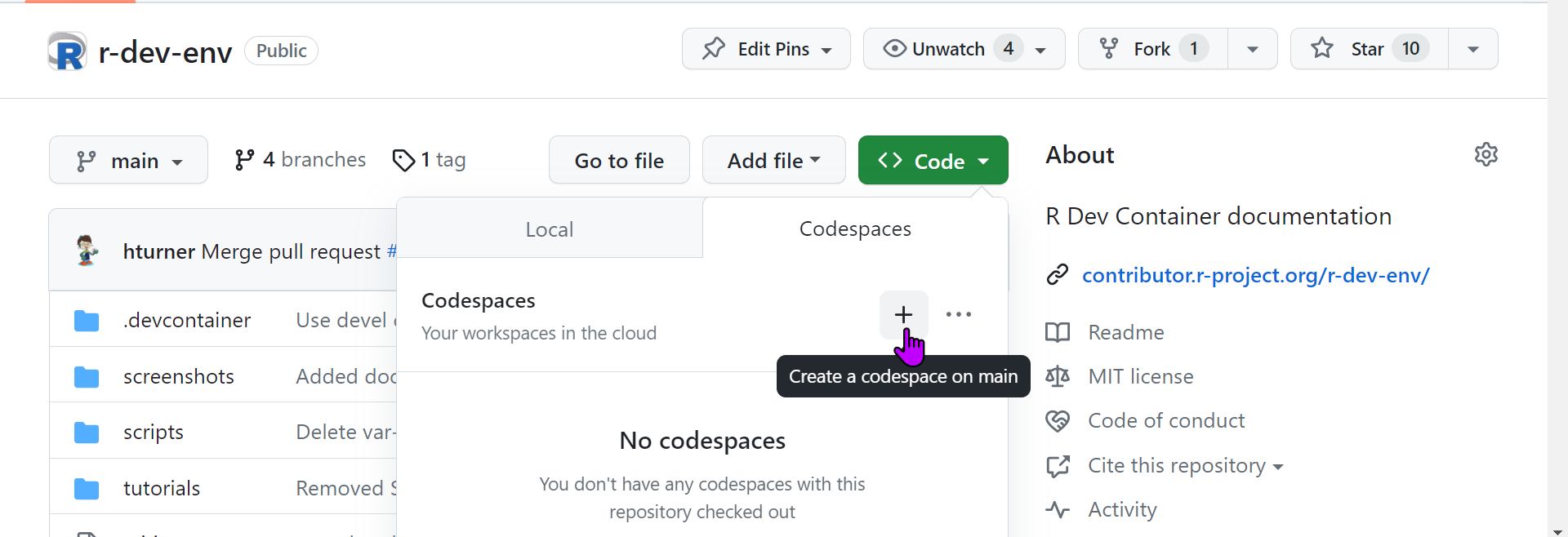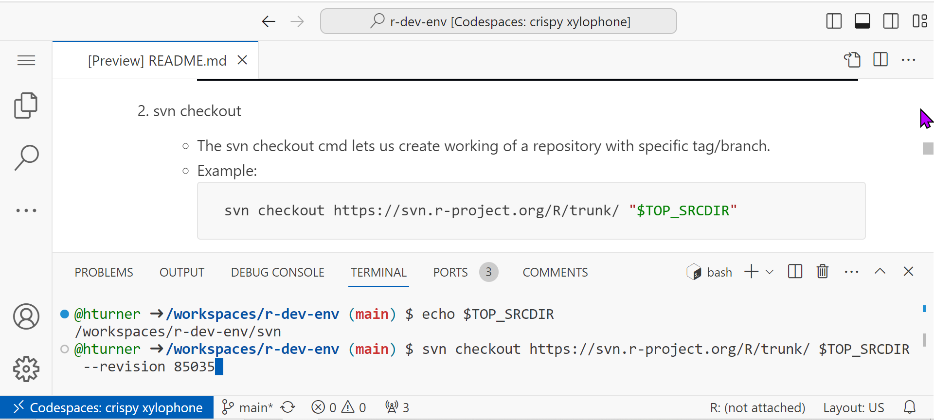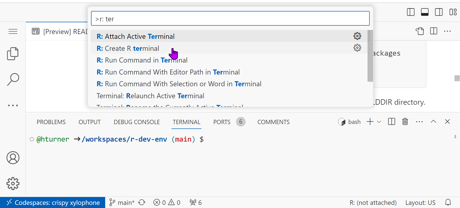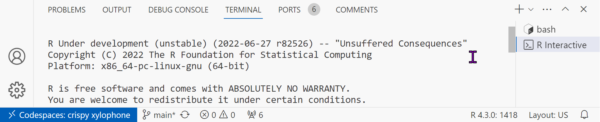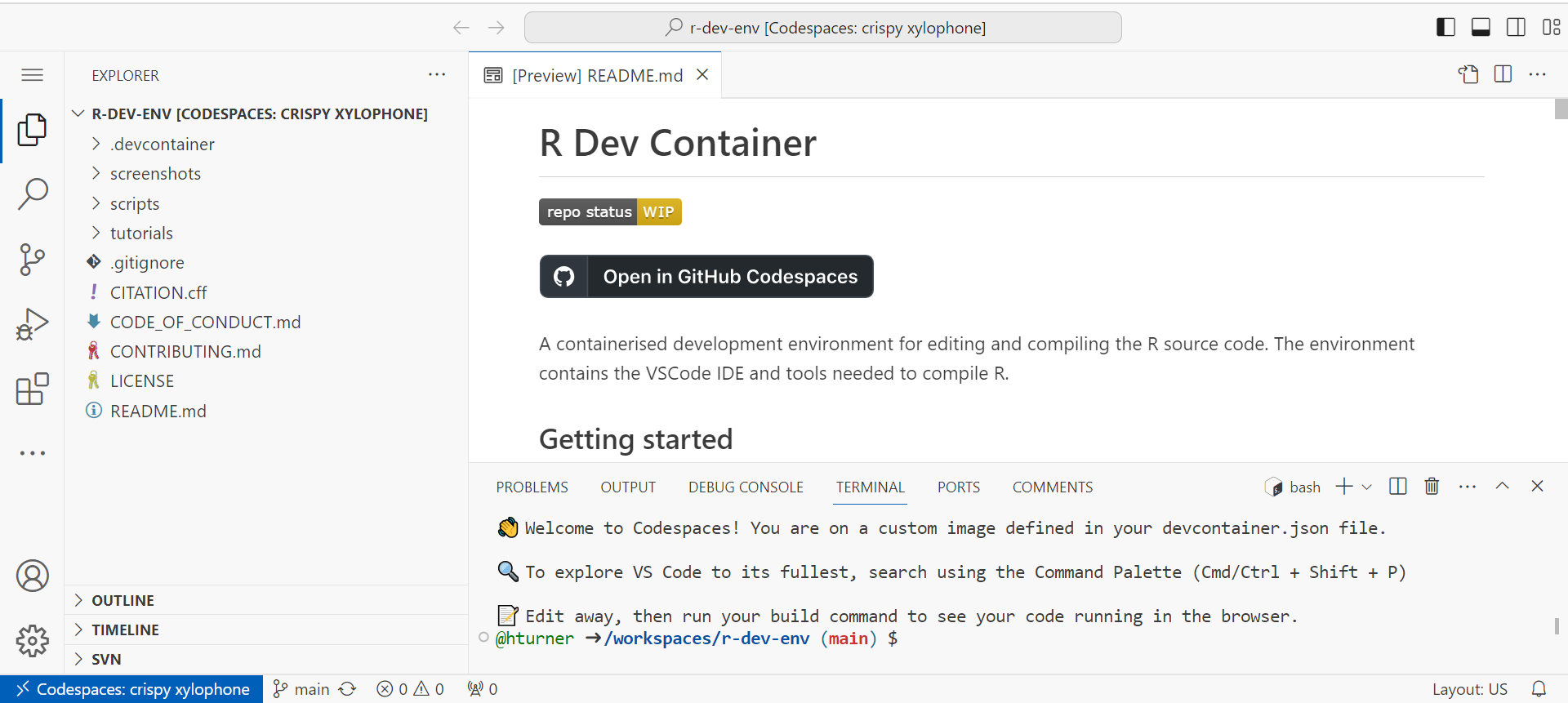 The R Dev Container is a GitHub Codespace that provides a development environment - VS Code running on Linux - that can be run in the browser.