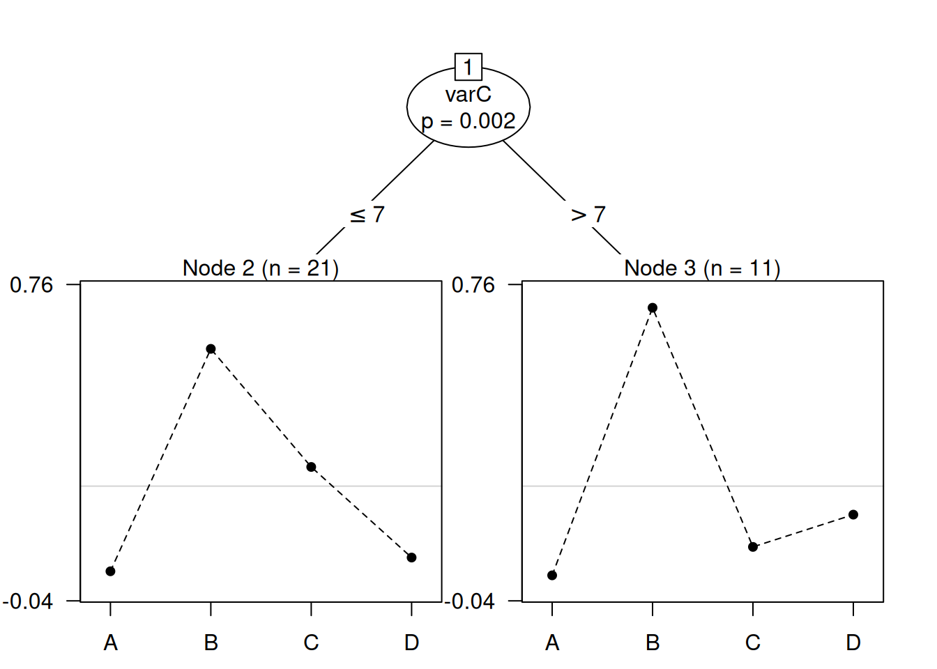 The result is a tree with two nodes; both groups prefer salad B, but the first group (varC ≤ 7) places salad C in second place, while the second group (varC > 7) prefer salad D. This is as we might expect, since we simulated the judge covariate varC to correlate with the ranking of C, so a higher value of this variable correlates to a lower preference for C. We can see the difference in the coefficients of the item features: